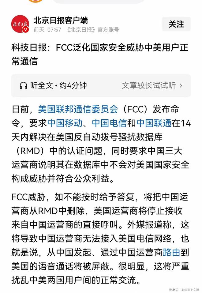 美国给中国三大运营商限时14天解决“骚扰电话”问题,否则将被禁止接入美国电信网络。路透社晒出FCC 12月12日警告信全文:中国移动、中国电信、中国联通必须在美国数据库中填写“来电身份验证”。 12月27日之前RMD。否则,美国各地运营商将一键将其列入黑名单,中国的座机手机将直接显示“您拨打的号码不存在”。消息一出,国内社交媒体平台的画风有些神秘——“终于有人替我骂三大哥了”、“太平洋彼岸先帮我面对骚扰了”。最受欢迎的评论是“我建议FCC在促进房地产、贷款和幼儿教育方面多照顾三个第一”。官方数据也提振了公众情绪:1工信部2321举报中心11月份接到诈骗电话4.1万通,其中62%为虚拟号码。很多人一天被叫五次,比闹钟还及时。混乱的背后,是华盛顿的盘算。 FCC主席公布了一组“神秘数字”,2024年前三季度美国同比增长38%。租金每分钟0.8美分。如果转卖的话,可以骗到5美元,而且利差比卖iPhone还要差。美方认为,三大运营商没有明确表明“谁在打电话”,相当于给灰色通道打开了一扇侧门。在更深层次上,国会正在审查《通信安全护栏法案》。该草案包括一项规定,“受外国政府严格控制的运营商必须接受年度安全评估”。明眼人都知道是谁他们的目标一目了然。 14天的最后期限只是一个预警。下次会不会真的断线呢?历史数据显示:2019年,FCC以“国家安全”为由拒绝了中国移动在美国的牌照。后来,还收到了联通和太平洋网络的拒绝a。但中美之间的语音结算金额每年仍超过2亿美元,美国运营商不愿割下这块肥肉。业界预测最有可能的剧本是“妥协认证”——三家公司将技术接口放在第三国清算中心,一家欧洲公司做“身份印记”,既符合RMD格式,又不会把账本放在华盛顿眼皮子底下。时机也不对:美国大选之年。局势正在升温,对中国采取强硬态度就等于选票。 FCC可能会宣布“有限观察期”” 明年一月。如果延长90天,让双方都找到措施,真正断线的可能性不到30%。毕竟,在T-Mobile和Verizon的财报中,国际语音虽然只占收入的2%,却是最赚钱的摇钱树。谁不能靠钱生活呢?故事到这里,你觉得大洋彼岸的这波浪潮是真正的反骚扰,还是只是雪上加霜?留言区聊聊,如果接到“00”开头的号码,你接还是挂断? 信息来源:新华社2024-12-13 《中美电信运营调整通道面临新一轮认证调整》央视新闻2024-12-12 《美国FCC要求中国运营商在14天内完成骚扰电话认证》《中国日报》2024-12-11 《验证全球语音结算链路的游戏》